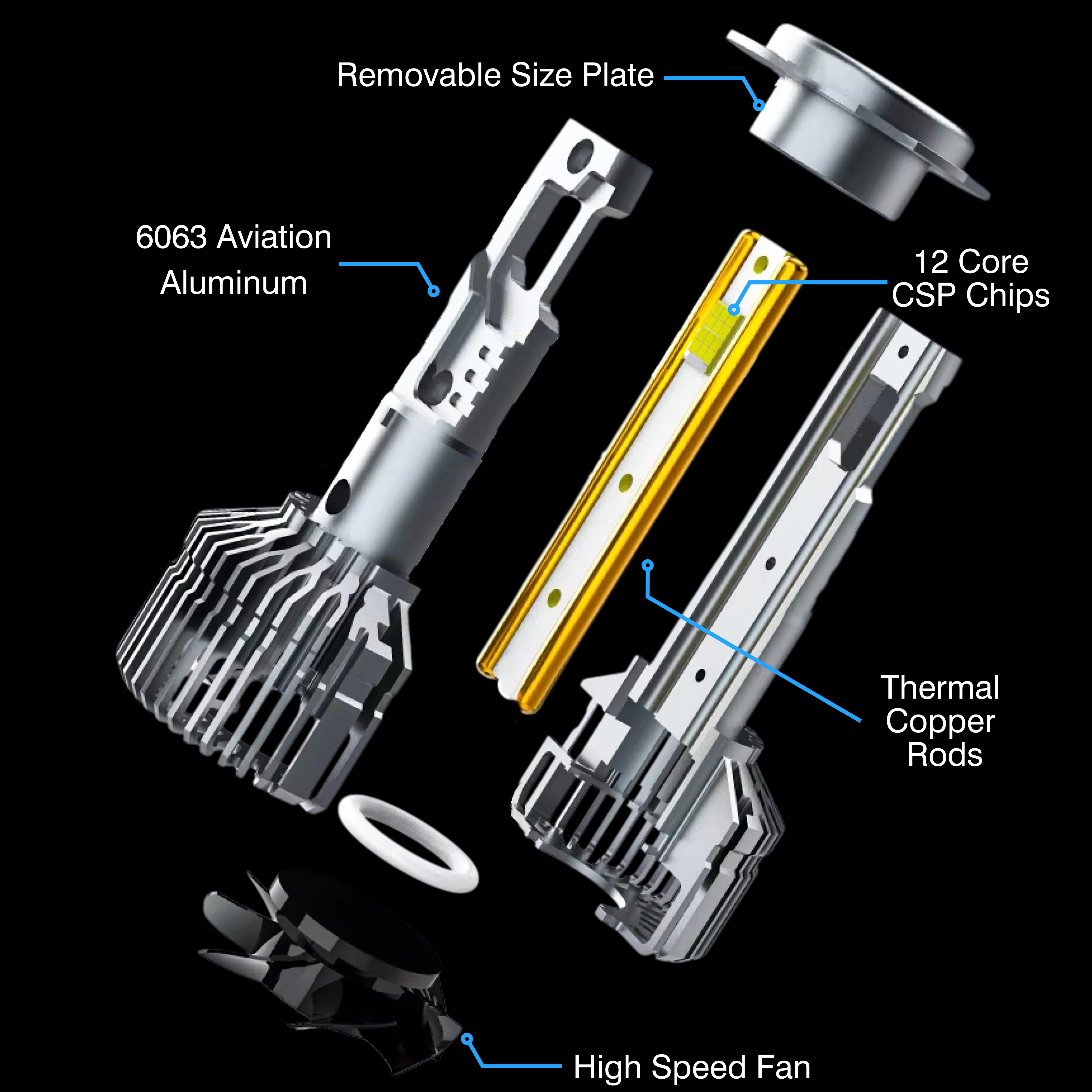 Experience the perfect blend of advanced engineering and long-lasting performance with the Auslights H7 LED Headlight Bulb Performance – Pair. Equipped with a high-speed micro-fan and dual thermal copper rods, it efficiently dissipates heat to maintain optimal performance and extend lifespan. The 12-core CSP chips deliver exceptional brightness and clarity, ensuring safer night-time driving. Its 6063 aviation-grade aluminium housing enhances durability while maximising thermal conductivity. For added versatility, the removable size plate ensures a seamless fit across a wide range of vehicles.